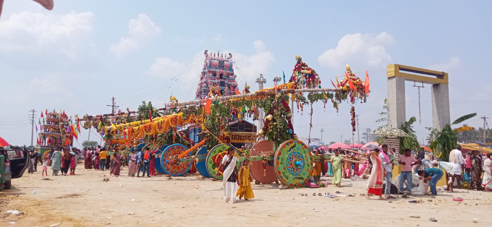 ಶನಿವಾರ ಸಂಜೆ ಐದೂವರೆ ಸುಮಾರಿಗೆ ಸಿಡಿ ಮತ್ತು ತೇರುಗಳನ್ನು ಒಂದರ ಹಿಂದೆ ಒಂದರಂತೆ ಮೂರು ಸುತ್ತು ಹುಣಸಮ್ಮ ದೇವಸ್ಥಾನ ಮತ್ತು ದೇವಸ್ಥಾನದ ಮುಂಭಾಗದ ಉಯ್ಯಾಲೆ ಕಂಬದ ಸುತ್ತ ಸಡಗರ-ಸಂಭ್ರಮದಿಂದ ಎಳೆಯುತ್ತಾರೆ. ಯುವಕರು ಸಿಡಿಯನ್ನು ಮೇಲೆ-ಕೆಳಗೆ ಮಾಡುತ್ತಾ ಆರ್ಭಟದಿಂದ ರಭಸವಾಗಿ ಎಳೆಯುವುದು, ಬಸ್ಸಿಗೆ ಸಡನ್ ಬ್ರೇಕ್ ಹಾಕಿದಂತೆ ತಟ್ಟನೆ ನಿಲ್ಲಿಸುವುದು ರೋಚಕವಾಗಿರುತ್ತದೆ! ಸಿಡಿ ಎಳೆಯುವವರ ಆರ್ಭಟದ ಮುಂದೆ ಕೈತೇರು ಎಳೆಯುವವರು ಸಪ್ಪಗಾಗಿ ಬಿಡುತ್ತಾರೆ. ಸಿಡಿ-ತೇರುಗಳು ಮೂರು ಸುತ್ತು ಬಂದ ನಂತರ ಕುರಿಮಂದೆಯನ್ನು ಬಿಡುತ್ತಾರೆ. ಕುರಿಮಂದೆ ಸುತ್ತುವಾಗ ಎದ್ದ ಧೂಳು ಇಡೀ ಜಾತ್ರಾ ಮೈದಾನವನ್ನು ಆವರಿಸುತ್ತದೆ. ಆದ್ದರಿಂದ ಜಾಣರು ಮೊದಲೇ ಪುರಿ-ಕಡ್ಲೆ, ತಿಂಡಿಗಳನ್ನು ಕಟ್ಟಿಸಿಕೊಂಡಿರುತ್ತಾರೆ. ಇದು ಹಳೆಯ ನೆನಪು; ಆದರೆ ಈಗ ದೇವಸ್ಥಾನದ ಸುತ್ತಲೂ ಕಾಂಕ್ರೀಟ್ ರಸ್ತೆ ಮಾಡಿದ್ದಾರೆ.