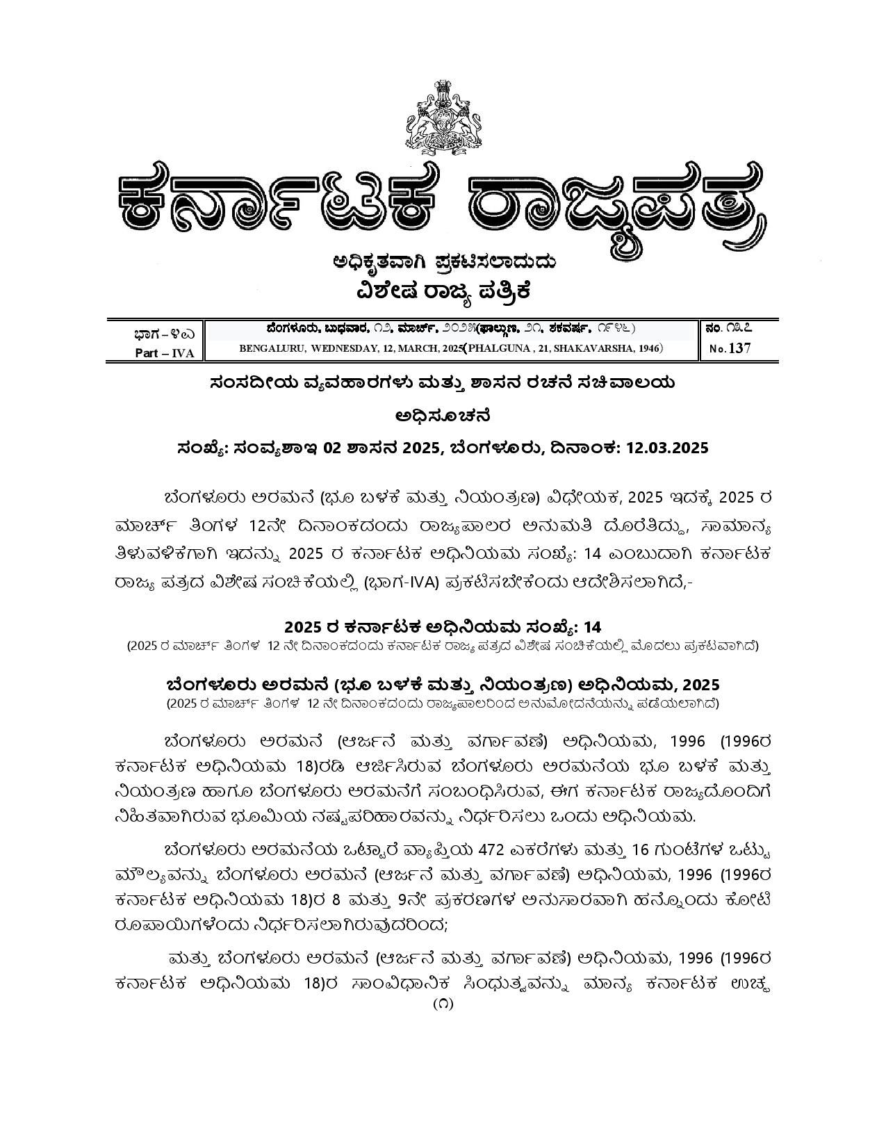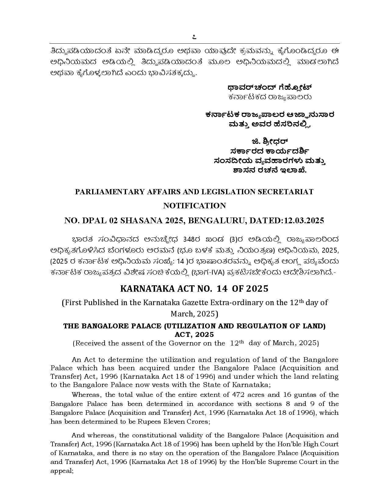 ಈ ಕುರಿತಂತೆ ರಾಜ್ಯ ಸರ್ಕಾರದಿಂದ ವಿಶೇಷ ಗೆಜೆಟ್ ಅಧಿಸೂಚನೆಯನ್ನು ಪ್ರಕಟಿಸಲಾಗಿದ್ದು, ಬೆಂಗಳೂರು ಅರಮನೆ (ಭೂ ಬಳಕೆ ಮತ್ತು ನಿಯಂತ್ರಣ) ವಿಧೇಯಕ, 2025 ಇದಕ್ಕೆ 2025 ರ ಮಾರ್ಚ್ ತಿಂಗಳ 12ನೇ ದಿನಾಂಕದಂದು ರಾಜ್ಯಪಾಲರ ಅನುಮತಿ ದೊರೆತಿದ್ದು, ಸಾಮಾನ್ಯ ತಿಳುವಳಿಕೆಗಾಗಿ ಇದನ್ನು 2025 ರ ಕರ್ನಾಟಕ ಅಧಿನಿಯಮ ಸಂಖ್ಯೆ: 14 ಎಂಬುದಾಗಿ ಕರ್ನಾಟಕ ರಾಜ್ಯ ಪತ್ರದ ವಿಶೇಷ ಸಂಚಿಕೆಯಲ್ಲಿ (ಭಾಗ-IVA) ಪ್ರಕಟಿಸಬೇಕೆಂದು ಆದೇಶಿಸಲಾಗಿದೆ ಎಂದಿದೆ.