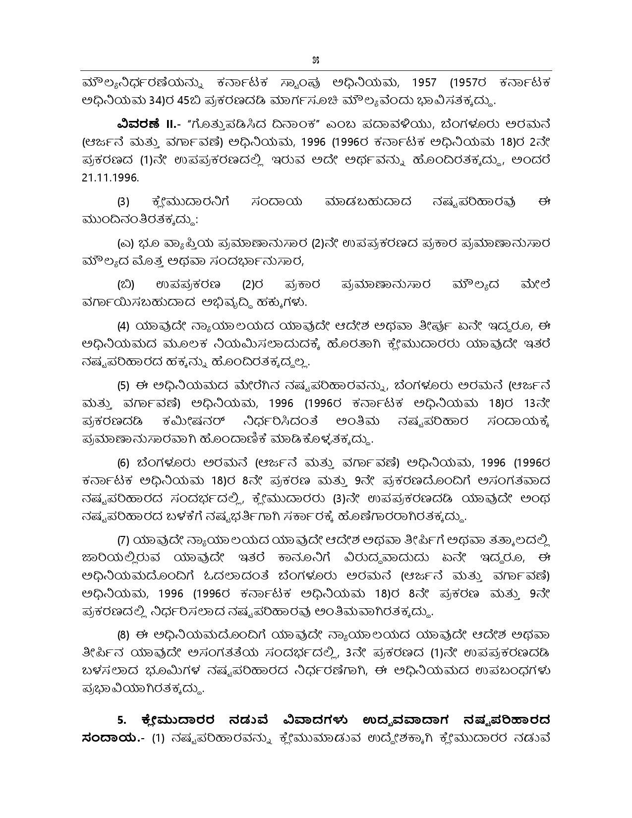 (ಡಿ) “ನಷ್ಟಪರಿಹಾರ”ವು ಸಂದಾಯ ಮಾಡಬಹುದಾದ ಯಾವುದೇ ಮೊತ್ತವನ್ನು ಒಳಗೊಳ್ಳತಕ್ಕದ್ದು ಮತ್ತು ವರ್ಗಾಯಿಸಬಹುದಾದ ಅಭಿವೃದ್ಧಿ ಹಕ್ಕುಗಳನ್ನೂ ಸಹ ಒಳಗೊಳ್ಳತಕ್ಕದ್ದು.