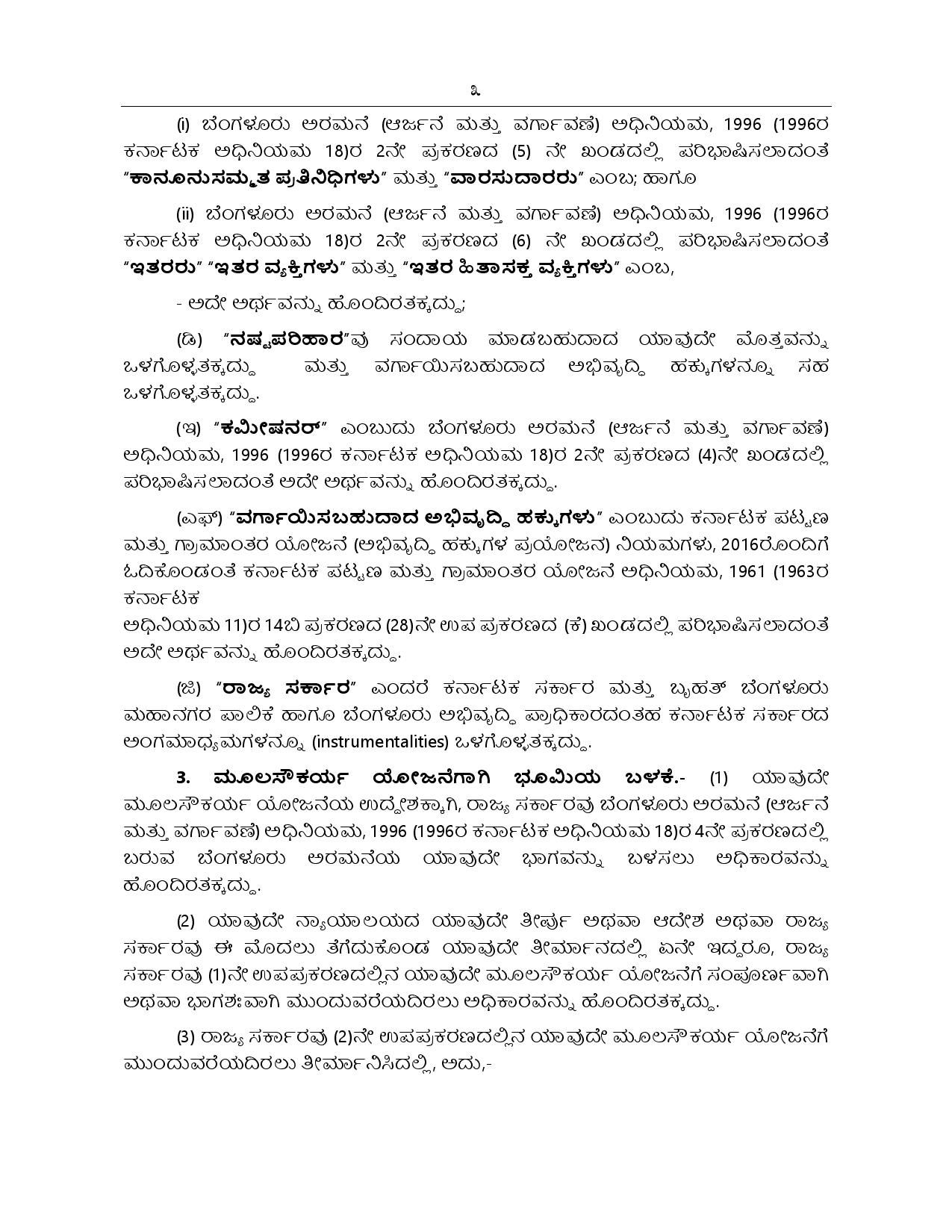 (ಜಿ) “ರಾಜ್ಯ ಸರ್ಕಾರ” ಎಂದರೆ ಕರ್ನಾಟಕ ಸರ್ಕಾರ ಮತ್ತು ಬೃಹತ್ ಬೆಂಗಳೂರು ಮಹಾನಗರ ಪಾಲಿಕೆ ಹಾಗೂ ಬೆಂಗಳೂರು ಅಭಿವೃದ್ಧಿ ಪ್ರಾಧಿಕಾರದಂತಹ ಕರ್ನಾಟಕ ಸರ್ಕಾರದ ಅಂಗಮಾಧ್ಯಮಗಳನ್ನೂ (instrumentalities) ಒಳಗೊಳ್ಳತಕ್ಕದ್ದು.