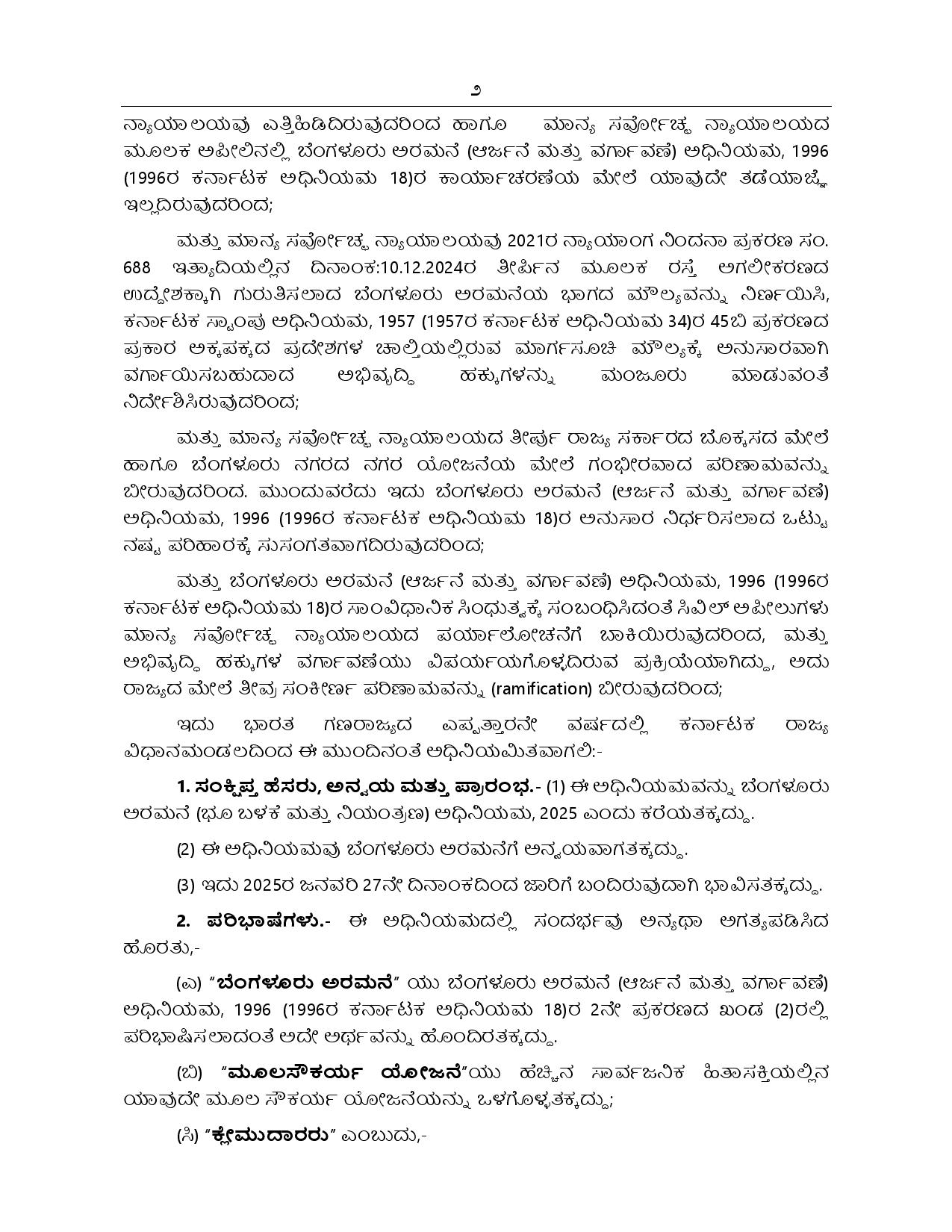 ಮತ್ತು ಮಾನ್ಯ ಸರ್ವೋಚ್ಛ ನ್ಯಾಯಾಲಯವು 2021ರ ನ್ಯಾಯಾಂಗ ನಿಂದನಾ ಪ್ರಕರಣ ಸಂ 688 ಇತ್ಯಾದಿಯಲ್ಲಿನ ದಿನಾಂಕ:10.12.2024ರ ತೀರ್ಪಿನ ಮೂಲಕ ರಸ್ತೆ ಅಗಲೀಕರಣದ ಉದ್ದೇಶಕ್ಕಾಗಿ ಗುರುತಿಸಲಾದ ಬೆಂಗಳೂರು ಅರಮನೆಯ ಭಾಗದ ಮೌಲ್ಯವನ್ನು ನಿರ್ಣಯಿಸಿ, ಕರ್ನಾಟಕ ಸ್ಟ್ಯಾಂಪು ಅಧಿನಿಯಮ, 1957 (1957ರ ಕರ್ನಾಟಕ ಅಧಿನಿಯಮ 34)ರ 45ಬಿ ಪ್ರಕರಣದ ಪುಕಾರ ಅಕ್ಕಪಕ್ಕದ ಪ್ರದೇಶಗಳ ಚಾಲ್ತಿಯಲ್ಲಿರುವ ಮಾರ್ಗಸೂಚಿ ಮೌಲ್ಯಕ್ಕೆ ಅನುಸಾರವಾಗಿ ವರ್ಗಾಯಿಸಬಹುದಾದ ಅಭಿವೃದ್ಧಿ ಹಕ್ಕುಗಳನ್ನು ಮಂಜೂರು ಮಾಡುವಂತೆ ನಿರ್ದೇಶಿಸಿರುವುದರಿಂದ;