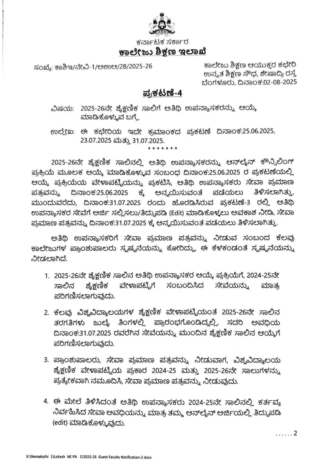 ಕರ್ನಾಟಕ ಸರ್ಕಾರದ ಕಾಲೇಜು ಶಿಕ್ಷಣ ಇಲಾಖೆ ಆಗಸ್ಟ್ 2ರಂದು ಬಿಡುಗಡೆಗೊಳಿಸಿರುವ ಪ್ರಕಟಣೆ-4ನ ಪ್ರಕಾರ, 2024-25ನೇ ಶೈಕ್ಷಣಿಕ ಸಾಲದಲ್ಲಿ ಸೇವೆ ಸಲ್ಲಿಸಿದ್ದ ಅತಿಥಿ ಉಪನ್ಯಾಸಕರ ಸೇವೆ ಮುಂದುವರಿಸಲು ಅರ್ಜಿ ಸಲ್ಲಿಕೆ, ಮೌಲ್ಯಮಾಪನ ಹಾಗೂ ಸೇವಾ ವಿಸ್ತರಣೆ ಸಂಬಂಧಿತ ಕ್ರಮಗಳನ್ನು ಜುಲೈ 25 ರಿಂದ ಜುಲೈ 31, 2025ರೊಳಗೆ ಪೂರ್ಣಗೊಳಿಸುವಂತೆ ಸೂಚಿಸಲಾಗಿದೆ.