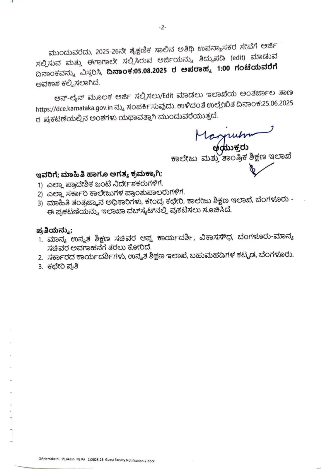 ಈ ಸಂಬಂಧ ಸಂಬಂಧಿತ ಕಾಲೇಜುಗಳು ಹಾಗೂ ಪ್ರಾಂಶುಪಾಲರು ಸೇವೆಯ ಅವಶ್ಯಕತೆ ಆಧಾರಿತವಾಗಿ ಸ್ವಂತ ನಿರ್ಧಾರ ತೆಗೆದುಕೊಳ್ಳುವಂತಾಗಿದೆ. 2025-26ನೇ ಸಾಲಿನ ಹೊಸ ನೇಮಕಾತಿಗೆ ಸಂಬಂಧಿಸಿದಂತೆ ಈಗಿನ ಅರ್ಜಿ ವಿವರಗಳನ್ನು ಆಧಾರವಾಗಿಟ್ಟುಕೊಂಡು ಮಾತ್ರ ತೀರ್ಮಾನ ಕೈಗೊಳ್ಳಲು ಸೂಚಿಸಲಾಗಿದೆ.