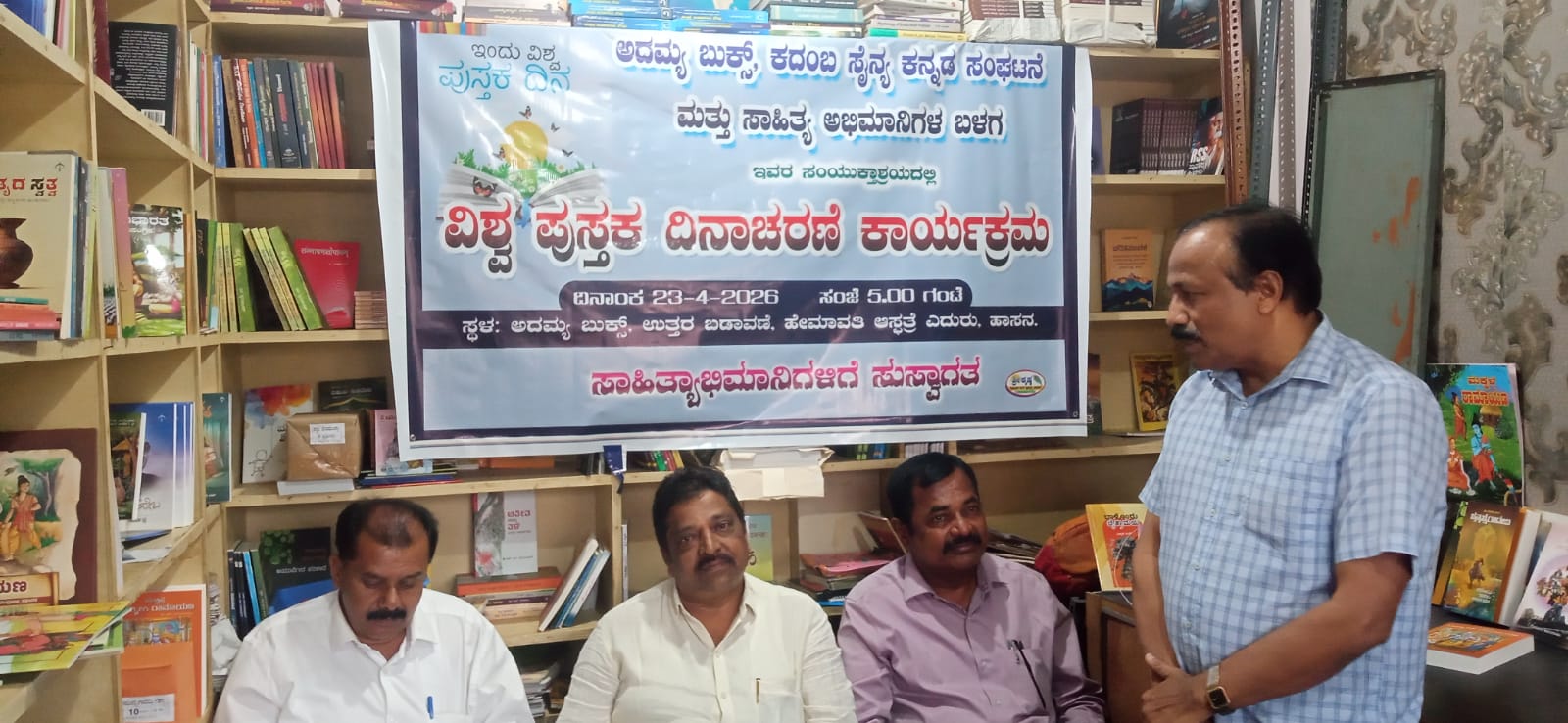 ಅವರು ವಿಶ್ವ ಪುಸ್ತಕ ದಿನದ ಅಂಗವಾಗಿ ಏಪ್ರಿಲ್ 23ರಂದು ಹಾಸನದ ಹೇಮಾವತಿ ಆಸ್ಪತ್ರೆ ಎದುರು ಇರುವ ಅದಮ್ಯ ಪುಸ್ತಕ ಭಂಡಾರದಲ್ಲಿ ಅದಮ್ಯ ಬುಕ್ಸ್, ಕದಂಬ ಸೈನ್ಯ ಕನ್ನಡ ಸಂಘಟನೆ ಹಾಗೂ ಸಾಹಿತ್ಯಾಭಿಮಾನಿಗಳ ಬಳಗದ ವತಿಯಿಂದ ಆಯೋಜಿಸಲಾದ ಕಾರ್ಯಕ್ರಮದಲ್ಲಿ ಮಾತನಾಡಿದರು.