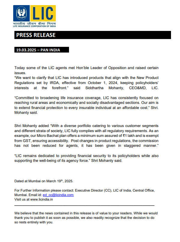 ಈ ಬಗ್ಗೆ ಪತ್ರಿಕಾ ಪ್ರಕಟಣೆ ಹೊರಡಿಸಿರುವ ಎಲ್ಐಸಿ “ ಸಂಸದ ರಾಹುಲ್ ಗಾಂಧಿ ಎಲ್ಐಸಿ ಏಜೆಂಟರ್ನ್ನು ಭೇಟಿಯಾಗಿ ಕೆಲವು ವಿಚಾರಗಳನ್ನು ಪ್ರಸ್ತಾಪಿಸಿದ್ದಾರೆ. ಈ ಬಗ್ಗೆ ಕೆಲವು ಸ್ಪಷ್ಟನೆ ನೀಡಲು ಬಯಸುತ್ತೇವೆ. ಎಲ್ಐಸಿ ಅಕ್ಟೋಬರ್ 1, 2024ರಿಂದ ಜಾರಿಗೆ ಬರುವಂತೆ ಐಆರ್ಡಿಎ ರೂಪಿಸಿರುವ ಹೊಸ ಉತ್ಪನ್ನಗಳ ನಿಯಮಕ್ಕೆ ಅನುಗುಣವಾಗಿ ಪಾಲಿಸಿದಾರರ ಹಿತಾಸಕ್ತಿ ಹಾಗೂ ಅವರ ಆದ್ಯತೆಗಳನ್ನು ಗಮನದಲ್ಲಿರಿಸಿಕೊಂಡು ಎಲ್ಐಸಿ ತನ್ನ ಉತ್ಪನ್ನಗಳನ್ನು ಪರಿಚಯಿಸಿದೆ. ಜೀವ ವಿಮಾ ರಕ್ಷಣೆಯನ್ನು ವಿಸ್ತರಿಸಲು ನಿಗಮವು ಬದ್ಧವಾಗಿದೆ. ಎಲ್ಐಸಿ ನಿರಂತರವಾಗಿ ಗ್ರಾಮೀಣ ಪ್ರದೇಶ , ಆರ್ಥಿಕವಾಗಿ ಹಾಗೂ ಸಾಮಾಜಿಕವಾಗಿ ಹಿಂದುಳಿದ ಪ್ರದೇಶವನ್ನು ತಲುಪಲು ತನ್ನ ಕಾರ್ಯಚಟುವಟಿಕೆಯನ್ನು ಕೇಂದ್ರೀಕರಿಸಿದೆ. ವಿಮೆಗೆ ಅರ್ಹವಾದ ಪ್ರತಿಯೊಬ್ಬ ವ್ಯಕ್ತಿಗೆ ಕೈಗೆಟುಕುವ ದರದಲ್ಲಿ ಆರ್ಥಿಿಕ ರಕ್ಷಣೆಯನ್ನು ವಿಸ್ತರಿಸುವುದು ನಮ್ಮ ಗುರಿ “ ಎಂದು ಎಲ್ಐಸಿ ಸಿಇಒ ಹಾಗೂ ಎಂಡಿ ಸಿದ್ದಾರ್ಥ ಮೊಹಾಂತಿ ತಿಳಿಸಿದ್ದಾರೆ.
