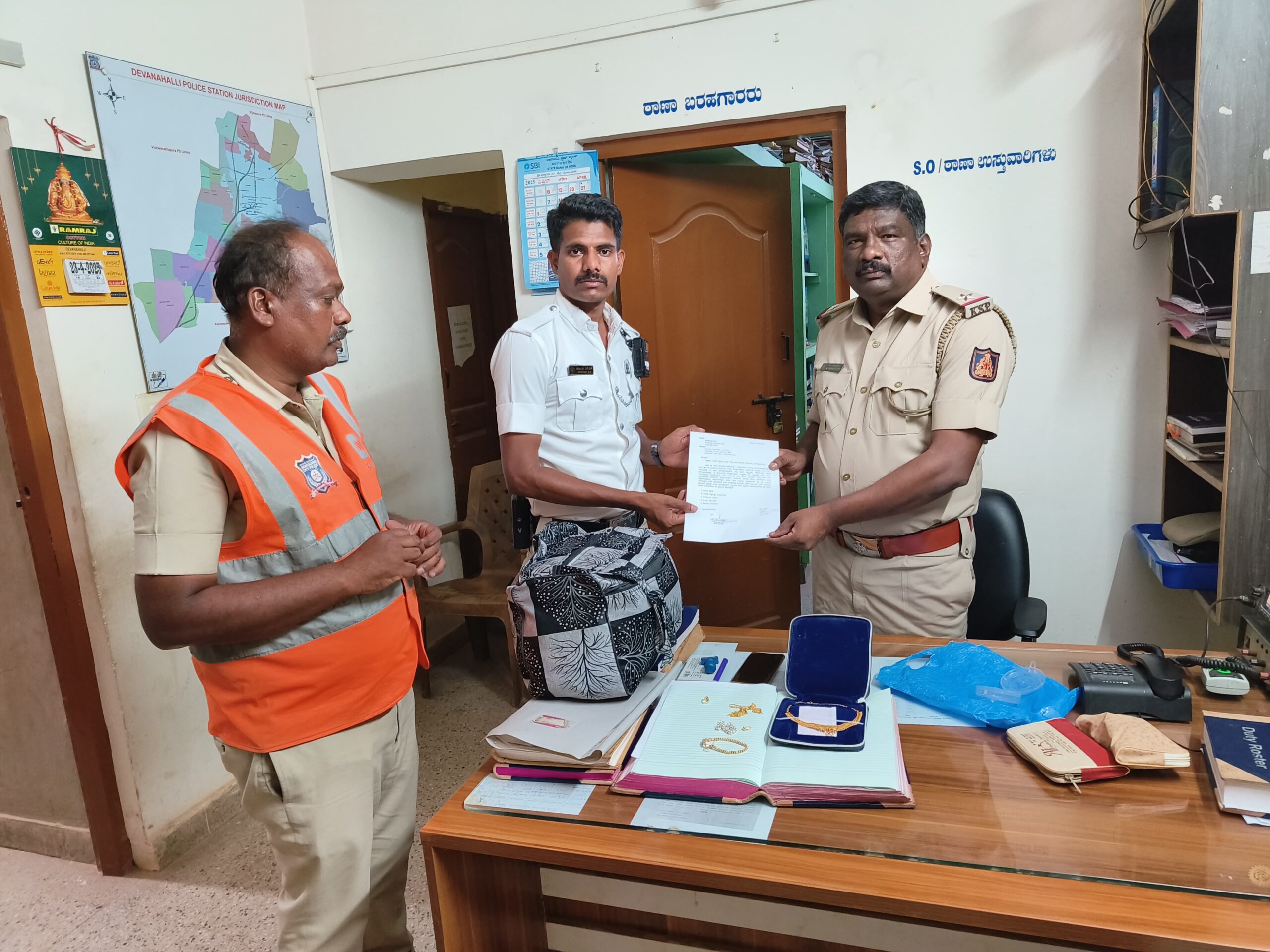 ದೊಡ್ಡಬಳ್ಳಾಪುರ ಸಿಗ್ನಲ್ ಬಳಿ ಸಿಕ್ಕಿದ್ದ ಅಮೂಲ್ಯ ಆಭರಣಗಳಿರುವ ಬ್ಯಾಗ ಏ.22 ರಂದು ಪತ್ತೆಯಾಗಿತ್ತು, ಅದನ್ನು ತಕ್ಷಣವೇ ದೇವನಹಳ್ಳಿ ಕಾನೂನು ಸುವ್ಯವಸ್ಥೆ ಪೊಲೀಸ್ ಠಾಣೆಗೆ ಹಸ್ತಾಂತರಿಸಿದ್ದು, ಬಳಿಕ ಪೊಲೀಸರು ತನಿಖೆ ನಡೆಸಿ ಆ ಆಭರಣಗಳ ನಿಜ ಮಾಲೀಕರನ್ನು ಪತ್ತೆಹಚ್ಚಿ ಏ.23 ರಂದು ಅವರನ್ನು ಕರೆಸಿ ಆಭರಣಗಳನ್ನು ತಲುಪಿಸಿ ಪ್ರಾಮಾಣಿಕತೆ ಮೆರೆದಿದ್ದಾರೆ.