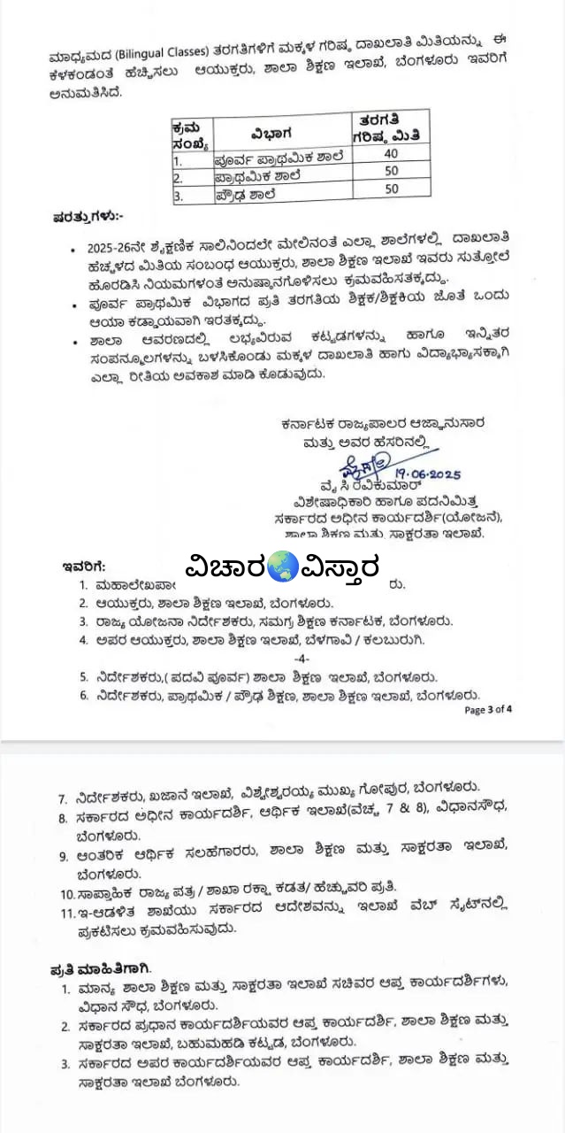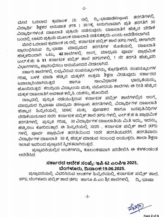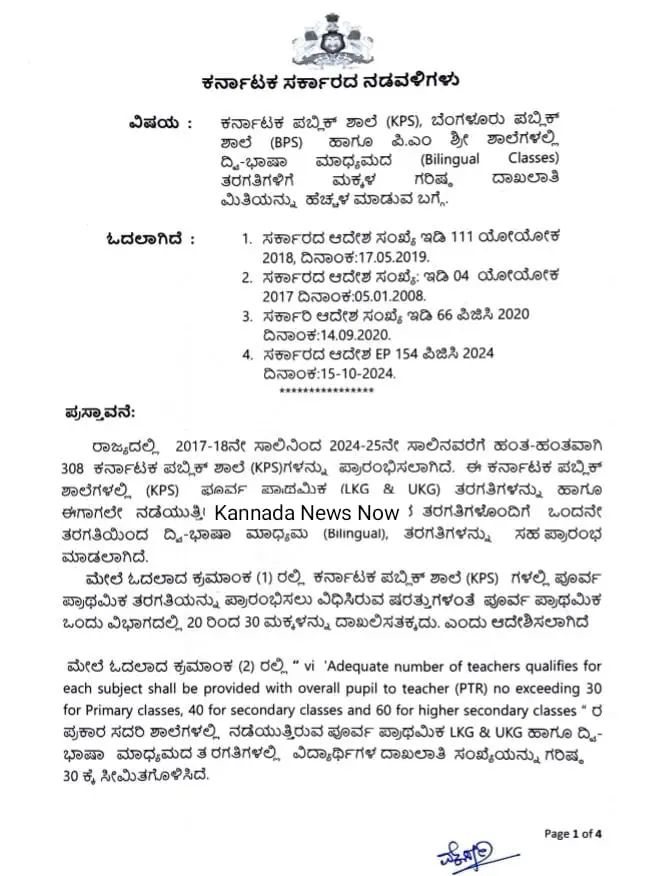 ಕರ್ನಾಟಕ ಪಬ್ಲಿಕ್ ಶಾಲೆ (KPS), ಬೆಂಗಳೂರು ಪಬ್ಲಿಕ್ ಶಾಲೆ (BPS) ‘ಹಾಗೂ ಪಿ.ಎಂ ಶ್ರೀ ಶಾಲೆಗಳಲ್ಲಿ ದಿ-ಭಾಷಾ ಮಾಧ್ಯಮದ (Bilingual Classes) ತರಗತಿಗಳಿಗೆ ಮಕ್ಕಳ ಗರಿಷ್ಠ ಮಿತಿಯನ್ನು ಹೆಚ್ಚಳ ಮಾಡಿ ರಾಜ್ಯ ಸರ್ಕಾರ ಮಹತ್ವದ ಆದೇಶ ಹೊರಡಿಸಿದೆ.