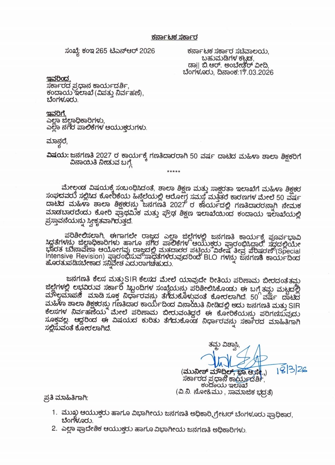 ಈ ಸುತ್ತೋಲೆಯನ್ನು ರಾಜ್ಯದ ಕೆಳಕಂಡ ಅಧಿಕಾರಿಗಳಿಗೆ ರವಾನಿಸಲಾಗಿದೆ: