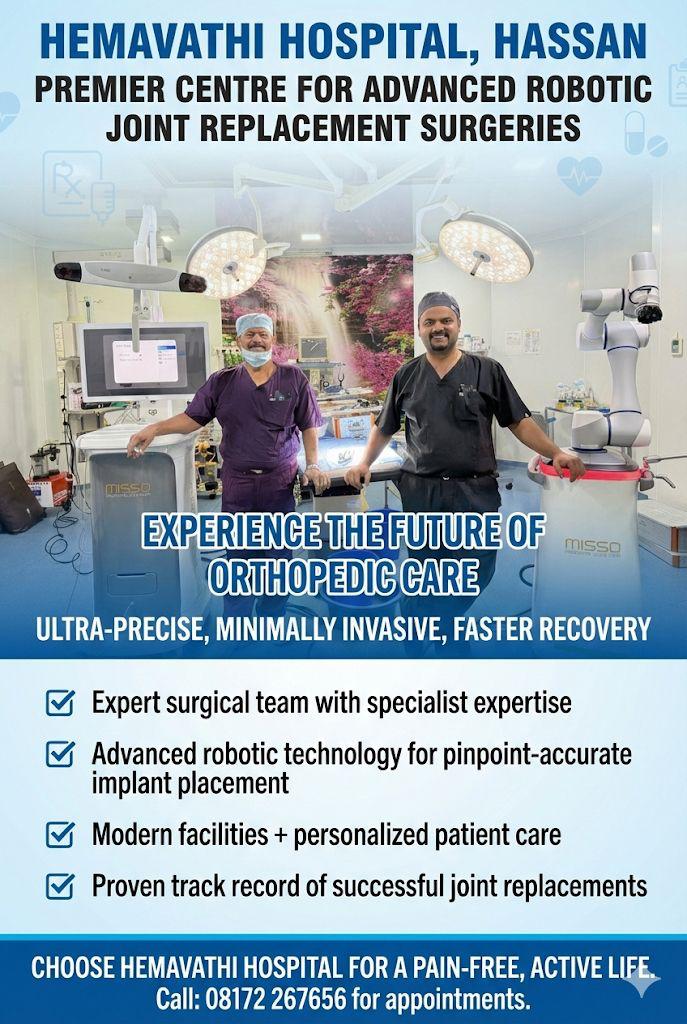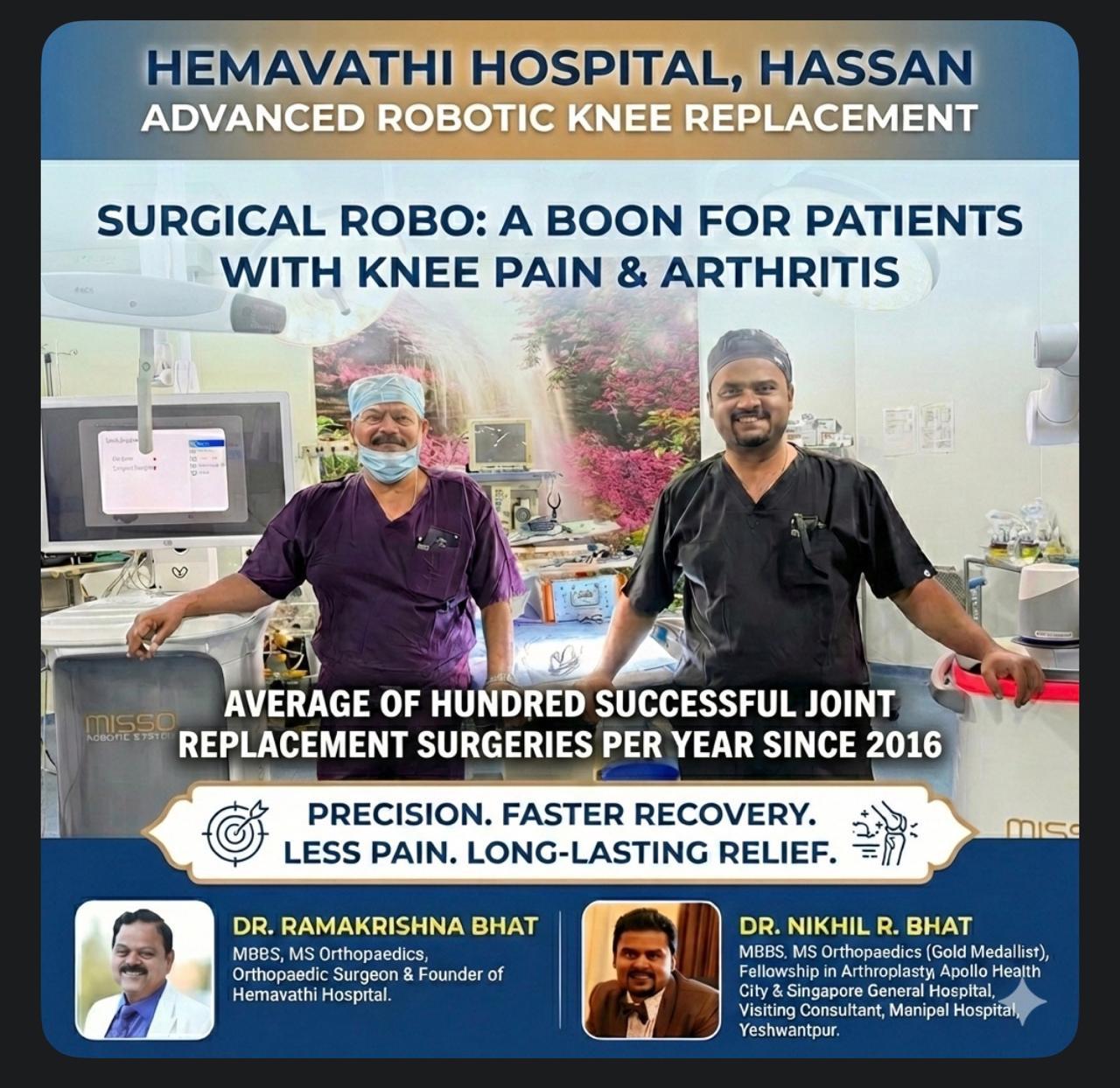 ಹೇಮಾವತಿ ಆಸ್ಪತ್ರೆನಲ್ಲಿ ಇದೀಗ ಅತ್ಯಾಧುನಿಕ ರೋಬೋಟಿಕ್ ತಂತ್ರಜ್ಞಾನದಿಂದ ಮೊಣಕಾಲು ಬದಲಿ (Knee Replacement) ಶಸ್ತ್ರಚಿಕಿತ್ಸೆ ಪ್ರಪ್ರಥಮವಾಗಿ ಆರಂಭಗೊಂಡಿದ್ದು, ಹಾಸನ ಜಿಲ್ಲೆಯ ಜನತೆಗೆ ಮಹತ್ವದ ಆರೋಗ್ಯ ಸೌಲಭ್ಯ ಒದಗಿಸಲಾಗಿದೆ. ಇದರಿಂದ ಬೆಂಗಳೂರು, ಮೈಸೂರು ಸೇರಿದಂತೆ ದೊಡ್ಡ ನಗರಗಳಿಗೆ ಹೋಗಬೇಕಾದ ಅವಶ್ಯಕತೆ ಕಡಿಮೆಯಾಗಿದ್ದು, ಸ್ಥಳೀಯವಾಗೇ ಉನ್ನತ ಮಟ್ಟದ ಚಿಕಿತ್ಸೆ ದೊರಕುತ್ತಿರುವುದು ಸಂತಸದ ಸಂಗತಿ.