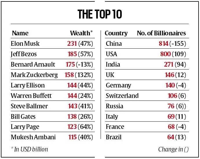 ಈ ಪಟ್ಟಿ ಪ್ರಕಾರ, ಅಮೆರಿಕದ ತಂತ್ರಜ್ಞಾನ ಕ್ಷೇತ್ರದ ಉದ್ಯಮಿಗಳು ಮುಂಚೂಣಿಯಲ್ಲಿದ್ದಾರೆ. ಭಾರತದ ಮುಕೇಶ್ ಅಂಬಾನಿ ಅವರು ಈ ಬಾರಿ ಟಾಪ್ 10 ಪಟ್ಟಿಯಿಂದ ಹೊರಗುಳಿದಿದ್ದಾರೆ, ಆದರೆ ಅವರು ಏಷ್ಯಾದ ಅತ್ಯಂತ ಶ್ರೀಮಂತ ವ್ಯಕ್ತಿಯಾಗಿ ಉಳಿದಿದ್ದಾರೆ.