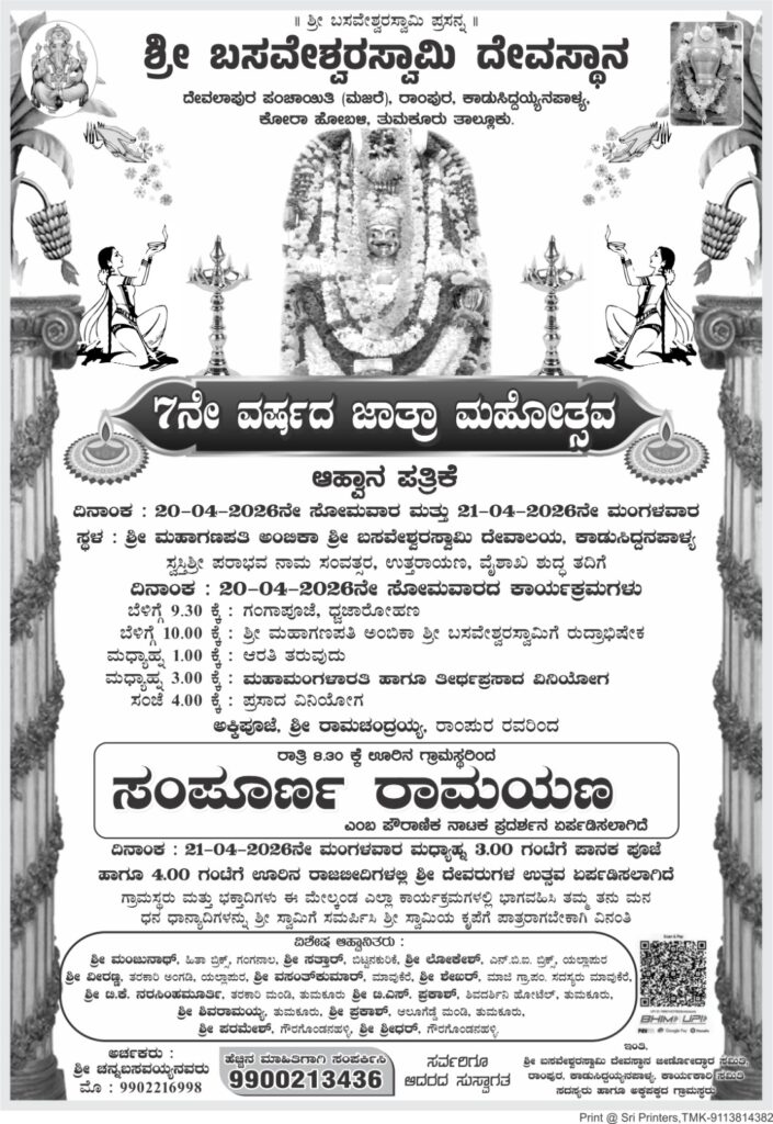ತುಮಕೂರು: ತಾಲೂಕಿನ ಕೋರ ಹೋಬಳಿಯ ದೇವಲಾಪುರ ಗ್ರಾಮ ಪಂಚಾಯತಿ ವ್ಯಾಪ್ತಿಯ ಕಾಡುಸಿದ್ದಯ್ಯನ ಪಾಳ್ಯದಲ್ಲಿ ನೆಲೆಸಿರುವ ಶ್ರೀ ಬಸವೇಶ್ವರ ಸ್ವಾಮಿಯ 7ನೇ ವರ್ಷದ ಜಾತ್ರಾ ಮಹೋತ್ಸವವು ಏ. 20 ಸೋಮವಾರ ಹಾಗೂ ಏ. 21 ಮಂಗಳವಾರ ನಡೆಯಲಿದೆ.