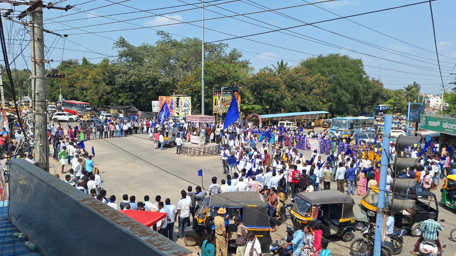 ತಾಲ್ಲೂಕು ದಲಿತ ಸಂಘಟನೆಗಳ ಒಕ್ಕೂಟ, ತಾಲ್ಲೂಕು ಛಲವಾದಿ ಮಹಾಸಭಾ, ಕರ್ನಾಟಕ ರಾಜ್ಯ ದಲಿತ ಸಂಘರ್ಷ ಸಮಿತಿ, ಕರ್ನಾಟಕ ದಲಿತ ಸಂಘರ್ಷ ಸಮಿತಿ, ಕರ್ನಾಟಕ ದಲಿತ ಸೇನೆ ಸೇರಿದಂತೆ ವಿವಿಧ ದಲಿತ ಪರ ಸಂಘಟನೆಗಳ ಸಂಯುಕ್ತ ಆಶ್ರಯದಲ್ಲಿ ಪಟ್ಟಣದ ಪ್ರವಾಸಿ ಮಂದಿರದಿಂದ ತಮಟೆ ಚಳುವಳಿ ಮೂಲಕ ಮೆರವಣಿಗೆ ನಡೆಸಿದ ಸಾವಿರಾರು ಕಾರ್ಯಕರ್ತರು ತಾಲ್ಲೂಕು ಕಚೇರಿಗೆ ಮುತ್ತಿಗೆ ಹಾಕಿ ಕೂಡಲೇ ತಾಲ್ಲೂಕು ಕಚೇರಿ ಮುಂಭಾಗ ತಾಲ್ಲೂಕು ಆಡಳಿತದ ವತಿಯಿಂದ ಸಂವಿಧಾನ ಶಿಲ್ಪಿ ಅಂಬೇಡ್ಕರ್ ಪ್ರತಿಮೆ ಸ್ಥಾಪನೆ ಮಾಡಬೇಕು.