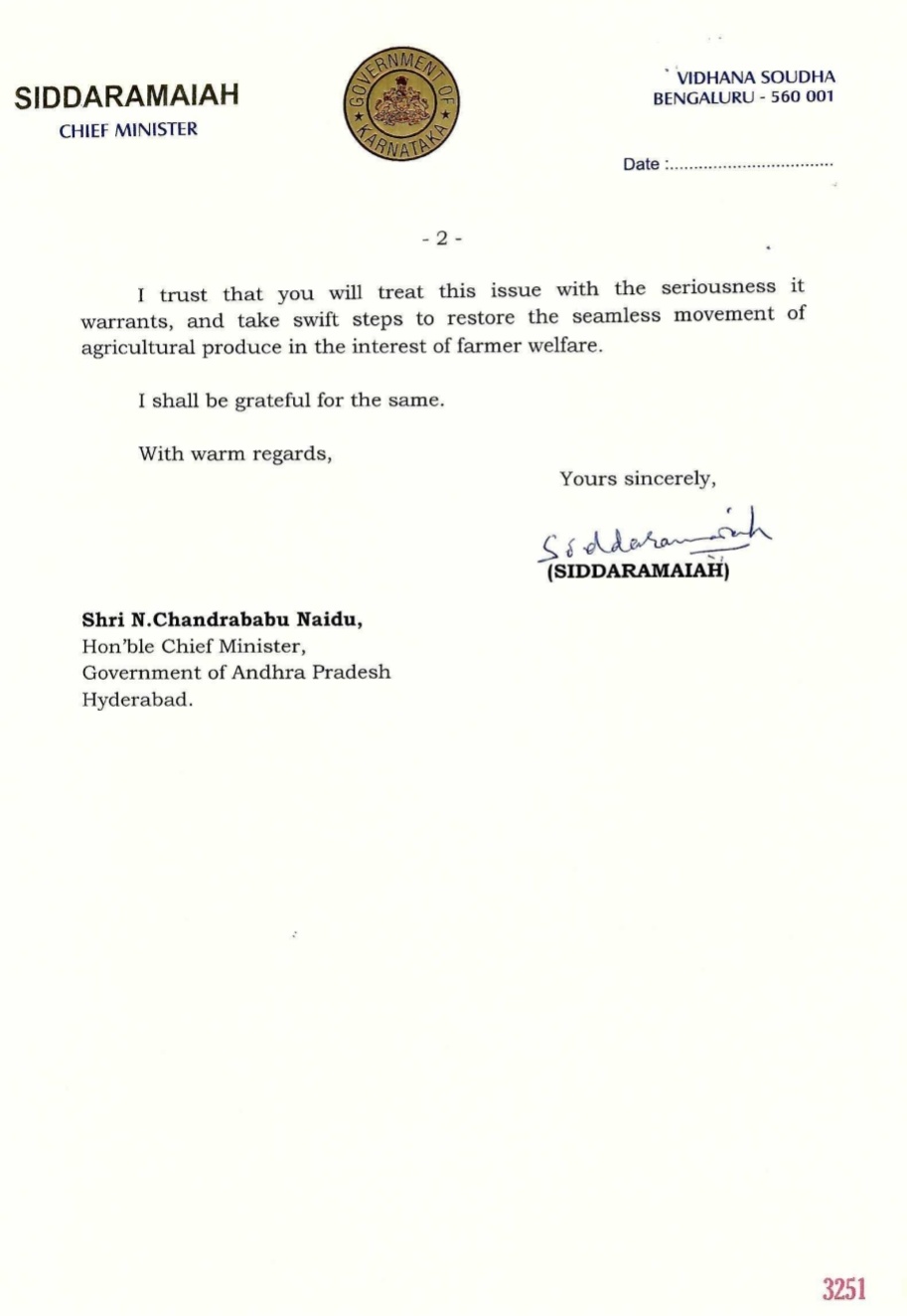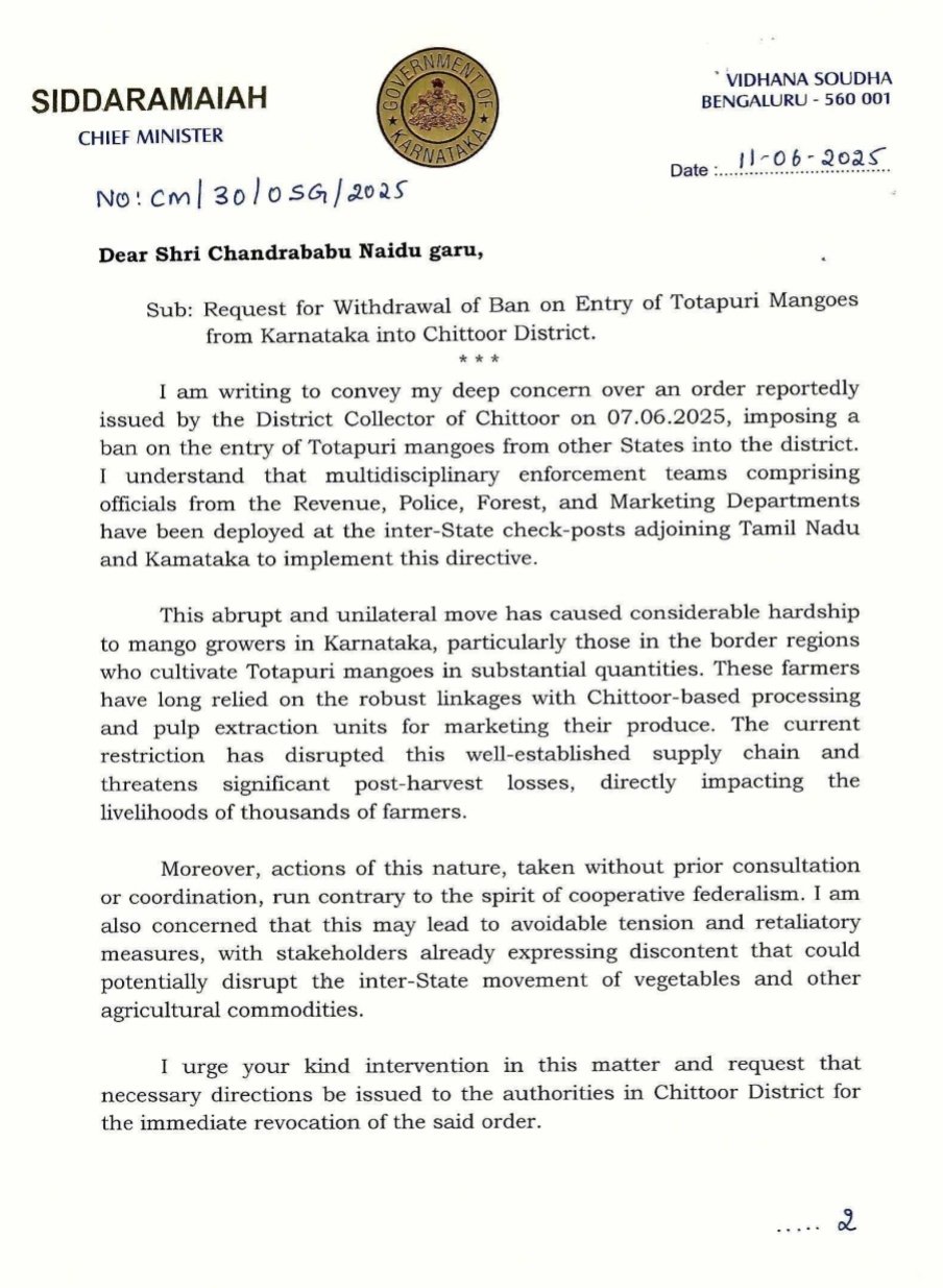 ಸಿಎಂ ಸಿದ್ದರಾಮಯ್ಯ ಅವರು ಆಂಧ್ರಪ್ರದೇಶ ಮುಖ್ಯಮಂತ್ರಿ ಚಂದ್ರಬಾಬು ನಾಯ್ಡು ಅವರಿಗೆ ಪತ್ರ ಬರೆದಿದ್ದು, ಚಿತ್ತೂರು ಜಿಲ್ಲಾಡಳಿತವು ಕರ್ನಾಟಕದ ತೋತಾಪುರಿ ಮಾವು ಖರೀದಿ ಮೇಲೆ ಹೇರಿದ್ದ ನಿರ್ಬಂಧವನ್ನು ತೆರವುಗೊಳಿಸುವಂತೆ ಜಿಲ್ಲಾಡಳಿತಕ್ಕೆ ಸೂಚಿಸಬೇಕು ಎಂದು ಮನವಿ ಮಾಡಿದ್ದಾರೆ.