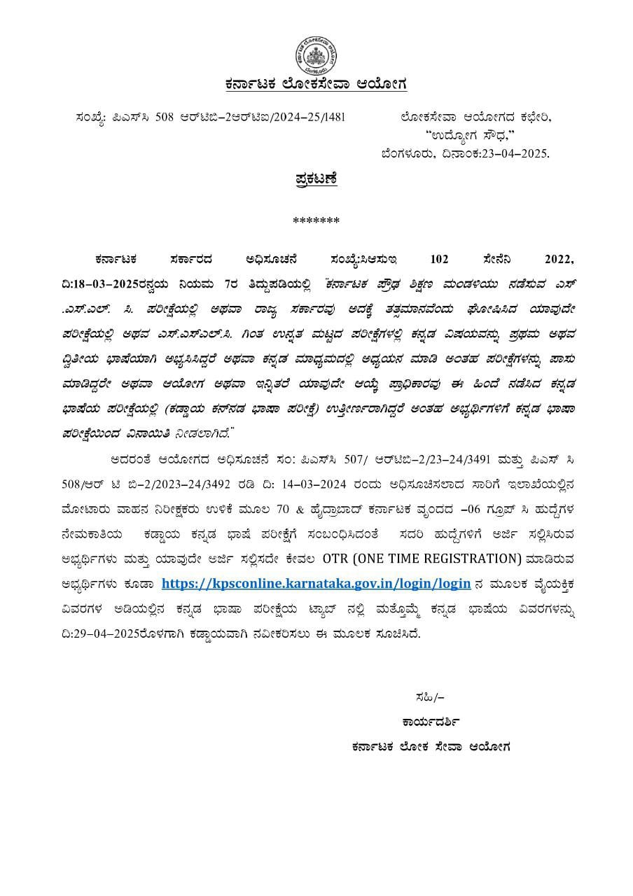 SSLC ಯಲ್ಲಿ ಅಥವಾ SSLC ಗಿಂತ ಉನ್ನತ ಮಟ್ಟದ ಪರೀಕ್ಷೆಗಳಲ್ಲಿ ಕನ್ನಡವನ್ನು ಪ್ರಥಮ / ದ್ವಿತೀಯ ಭಾಷೆಯಾಗಿ ಅಧ್ಯಯನ ಮಾಡಿ ಉತ್ತೀರ್ಣರಾದ ಹಾಗೂ KEA ನಡೆಸಿದ ಕಡ್ಡಾಯ ಕನ್ನಡ ಪರೀಕ್ಷೆಯಲ್ಲಿ ಉತ್ತೀರ್ಣರಾದ ಅಭ್ಯರ್ಥಿಗಳಿಗೆ KPSC ನಡೆಸುವ ಕಡ್ಡಾಯ ಕನ್ನಡ ಪರೀಕ್ಷೆಯಿಂದ ಇದೀಗ ವಿನಾಯಿತಿ ನೀಡಲಾಗಿದೆ.!