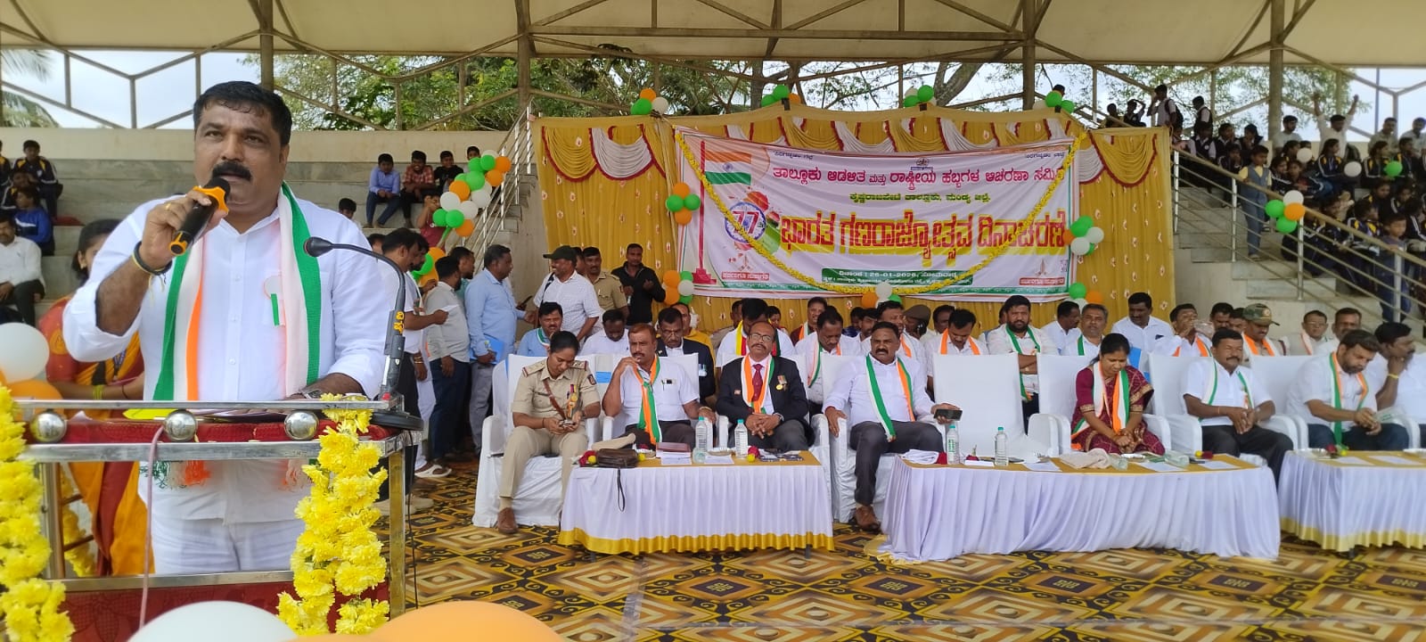 ತಾಲ್ಲೂಕು ಆಡಳಿತದ ವತಿಯಿಂದ ಪಟ್ಟಣದ ತಾಲ್ಲೂಕು ಕ್ರೀಡಾಂಗಣ ಆವರಣ ನಡೆದ 77ನೇ ಗಣರಾಜ್ಯೋತ್ಸವದ ಅಧ್ಯಕ್ಷತೆ ವಹಿಸಿ ಮಾತನಾಡಿದರು. ಜ.26 ಸಂವಿಧಾನ ಸಮರ್ಪಣೆ ದಿನವಾಗಿದ್ದು ಭಾರತದ ಸಂವಿಧಾನದಿಂದ ದೇಶದೆಲ್ಲೆಡೆ ಜನರು ಶಾಂತಿ, ಸಹಬಾಳ್ವೆ ಜೀವನ ನಡೆಸುತ್ತಿದ್ದಾರೆ. ದೇಶದಲ್ಲಿ ಸ್ವಾತಂತ್ಯ್ಯ ಮತ್ತು ಸಮಾನವಾಗಿ ಬದುಕುವ ಹಕ್ಕನ್ನು ಭಾರತ ಸಂವಿಧಾನ ನೀಡಿದೆ.ದೇಶದ ಪ್ರತಿಯೊಬ್ಬರೂ ಕೂಡ ಸಂವಿಧಾನ ಗೌರವಿಸುವ ಕೆಲಸ ಮಾಡಬೇಕು.ಕಟ್ಟುವೆವು ನಾವು ಹೊಸ ನಾಡೊಂದನು ರಸದ ಬೀಡೊಂದನು ಎಂಬ ಕವಿವಾಣಿಯಂತೆ ದೇಶವನ್ನು ಕಟ್ಟಬೇಕಾಗಿದೆ ಎಂದ ಅವರು ತಾಲ್ಲೂಕು ವಿವಿಧ ಪ್ರಗತಿಪರ ಸಂಘಟನೆಗಳು ತಾಲ್ಲೂಕು ಕೆಲ ಅಧಿಕಾರಿಗಳು ತೊಂದರೆ ಕೊಡುವುದು ನನ್ನ ಗಮನಕ್ಕೆ ಬಂದಿದೆ ನಾನು ಕೂಡ ರೈತ ಸಂಘಟನೆ ಮೂಲಕ ರಾಜಕೀಯಕ್ಕೆ ಬಂದಿದ್ದು ನಮಗೂ ಪ್ರಗತಿಪರ ಸಂಘಟನೆಗಳ ಮೇಲೆ ತುಂಬಾ ಗೌರವ ಇದೆ ಆದರೆ ಸಂಘಟನೆ ಹೆಸರಿನಲ್ಲಿ ಕೆಲ ವ್ಯಕ್ತಿಗಳು ಅಧಿಕಾರಿಗಳ ಕರ್ತವ್ಯಕ್ಕೆ ಅಡ್ಡಿ ಪಡಿಸುವುದು ಸರಿಯಲ್ಲ ಎಂದ ಅವರು.ರಾಜ್ಯಪಾಲರು ಈ ರೀತಿ ತಮ್ಮ ಭಾಷಣವನ್ನ ಪೂರ್ತಿ ಓದದೆ ಕೇವಲ ಸಾಂಕೇತಿಕವಾಗಿ ಮಂಡಿಸಿ ಹೊರಟಿರುವುದು ಇದೇನು ಮೊದಲಲ್ಲ. ಈ ಹಿಂದೆ ಇದ್ದ ಕೆಲ ಗೌರವಾನ್ವಿತ ಮಾಜಿ ರಾಜ್ಯಪಾಲರುಗಳು ಉದಾಹರಣೆಗಳಿವೆ.ಆಗಲೂ ಸಹ ಅವರನ್ನು ಭಾಷಣದ ಬಳಿಕ ಸದನದ ಸಂಪ್ರದಾಯಂದತೆ ರಾಷ್ಟ್ರಗೀತೆ ಹಾಡಿ ಗೌರವಯುತವಾಗಿ ಬೀಳ್ಕೊಡಲಾಗಿತ್ತು.ಆದರೆ ಇಂದು ರಾಜ್ಯಪಾಲರು ಭಾಷಣ ಮಂಡಿಸಿದ ನಂತರ ರಾಷ್ಟ್ರಗೀತೆಯನ್ನೂ ನುಡಿಸಲಿಲ್ಲ ಮತ್ತು ರಾಜ್ಯಪಾಲರನ್ನು ಗೌರವಯುತವಾಗಿ ಬೀಳ್ಕೊಡಲೂ ಇಲ್ಲ. ಇದು ಸಂವಿಧಾನ, ರಾಜ್ಯಪಾಲರ ಹುದ್ದೆಗೆ ಮಾಡಿರುವ ಘೋರ ಅಪಮಾನ ಶಾಸಕ ಹೆಚ್ ಟಿ ಮಂಜು ಹೇಳಿದರು.