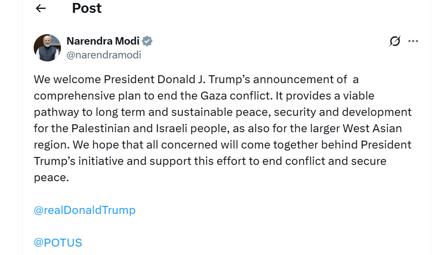 ಪ್ರಧಾನಿ ಮೋದಿ, “ಗಾಜಾ ಸಂಘರ್ಷವನ್ನು ಕೊನೆಗಾಣಿಸಲು ಅಧ್ಯಕ್ಷ ಟ್ರಂಪ್ ಮಂಡಿಸಿದ ಸಮಗ್ರ ಯೋಜನೆ ಶ್ಲಾಘನೀಯ. ಇದು ಪ್ಯಾಲೆಸ್ಟೀನಿಯನ್ ಮತ್ತು ಇಸ್ರೇಲಿ ಜನತೆಗೆ ದೀರ್ಘಕಾಲೀನ ಶಾಂತಿ, ಭದ್ರತೆ ಮತ್ತು ಅಭಿವೃದ್ಧಿಗೆ ದಾರಿ ತೋರಲಿದೆ” ಎಂದು ಹೇಳಿದ್ದಾರೆ.