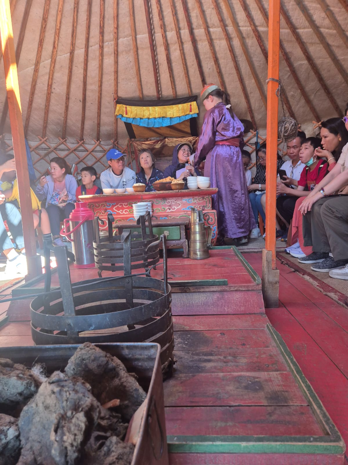 ಪ್ರವಾಸಿಗರನ್ನು ಅವರ ಯುರ್ಟ ಒಳಗೆ ಬರಮಾಡಿಕೊಂಡು, ಕೂರಿಸಿ ತಮ್ಮ ಆಥಿತ್ಯವನ್ನು ನೀಡುತ್ತಾರೆ. ಮೊದಲು ಹಾಲು, ಮತ್ತೆ ಚೀಸ್ ಹಾಗು ಕೊನೆಗೆ ಅವರು ತಯಾರಿಸಿದ ಸಿಹಿ ಕೊಡುತ್ತಾರೆ. ಇಲ್ಲಿಯ ವಿಶೇಷ, ಆ ಯುರ್ಟಿನ ಮುಖ್ಯಸ್ಥ ಬಂದ ಅತಿಥಿಗಳಿಗೆ ತನ್ನ ಧನಾತ್ಮಕ ಪಚ್ಚೆ, ನೀಲಿಮಣಿ ಅಥವ ಹವಳದಿಂದ ಮಾಡಿದ ಸೀಸೆಯಲ್ಲಿ ಭಾರತದಿಂದ ತರಿಸಿದ ಬೆಲೆಬಾಳುವ ಹೊಗೆ ಸೊಪ್ಪನ್ನು ನೀಡಿ ವಾಸನೆ ನೋಡಲು ಹೇಳುತ್ತಾರೆ. ನಮ್ಮ ಗ್ರಾಮೀಣ ಪ್ರದೇಶಗಳಲ್ಲಿ ನಾವು ಸಗಣಿ ಬೆರಣಿಯನ್ನು ಅಡಿಗೆ ಮನೆಯ ಒಲೆಗೆ ಅಥವ ಸ್ನಾನದ ಮನೆ ಒಲೆಗೆ ಉಪಯೋಗಿಸುವುದು ವಾಡಿಕೆ.