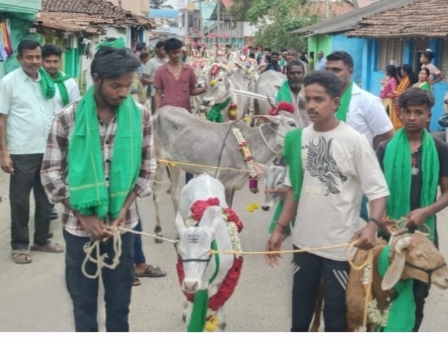 ರಾಮನಾಥಪುರ : ಕೇರಳಾಪುರದ ಶ್ರೀ ಪ್ರಸನ್ನ ವೀರಭದ್ರೇಶ್ವರಸ್ವಾಮಿ ಮಹಾ ರಥೋತ್ಸವದ ಹಿನ್ನಲೆಯಲ್ಲಿ ಜಾತ್ರೆಗೆ ಹೋರಿಗಳು, ಎತ್ತುಗಳು ಕರುಗಳನ್ನು ಗ್ರಾಮದ ಪ್ರಮುಖ ರಸ್ತೆಗಳಲ್ಲಿ ಮೆರವಣಿಗೆ ನಂತರ ಶ್ರೀ ವೀರಭದ್ರಸ್ವಾಮಿ ದೇವಾಲಯದಲ್ಲಿ ರಾಸುಗಳಿಗೆ ಪೂಜೆ ಸಲ್ಲಿಸಿದರು.
