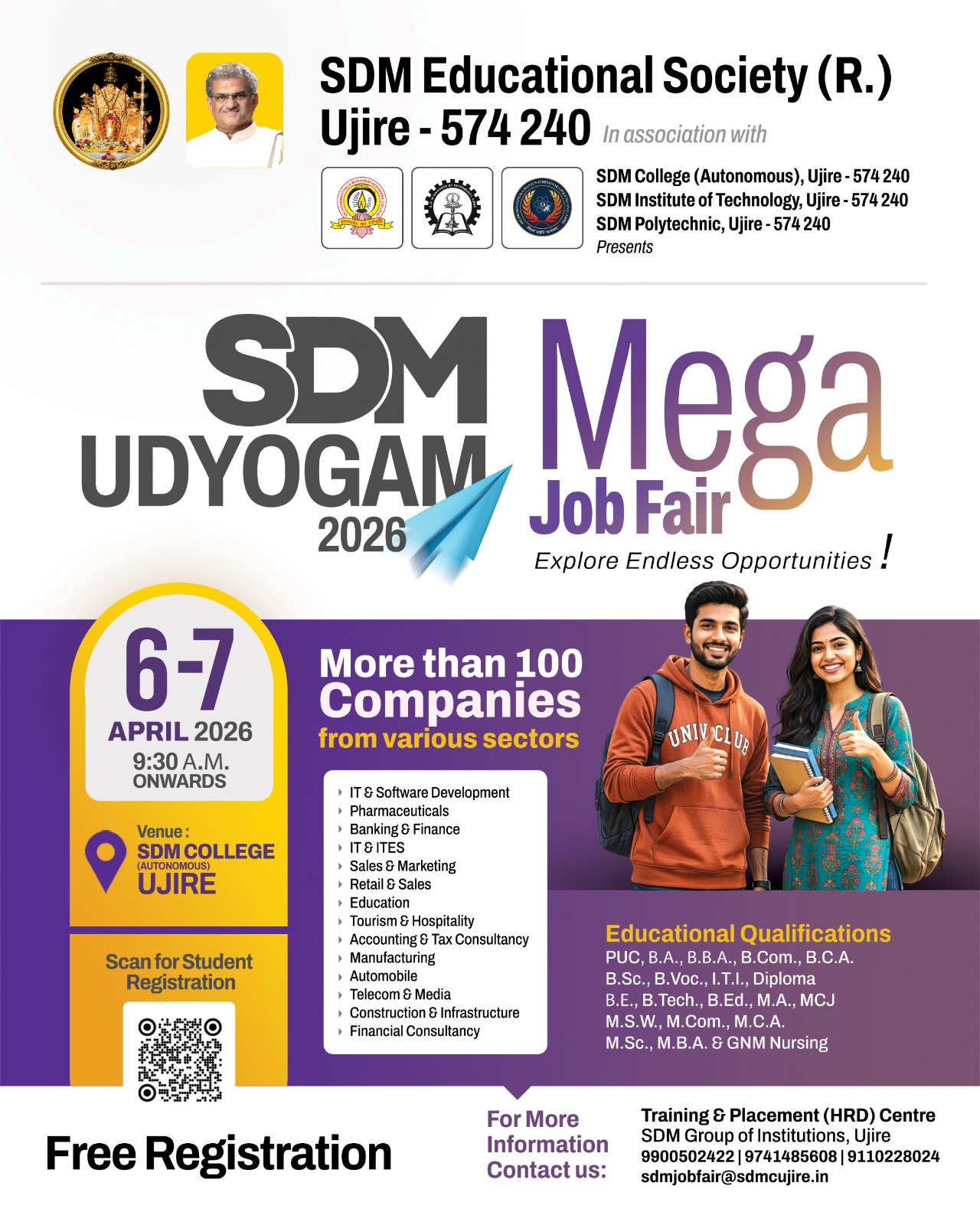 ಉಜಿರೆಯಲ್ಲಿ ಏಪ್ರಿಲ್ 6 ಮತ್ತು 7 ರಂದು ಎಸ್.ಡಿ.ಎಂ ಶಿಕ್ಷಣ ಸಂಸ್ಥೆ (ರಿ) ಇದರ ಆಶ್ರಯದಲ್ಲಿ ‘ಎಸ್.ಡಿ.ಎಂ ಉದ್ಯೋಗಂ – 2026’ ಎಂಬ ಬೃಹತ್ ಉದ್ಯೋಗ ಮೇಳ ನಡೆಯಲಿದೆ. ಉಜಿರೆಯ ಎಸ್.ಡಿ.ಎಂ ಕಾಲೇಜು (ಸ್ವಾಯತ್ತ), ಎಸ್.ಡಿ.ಎಂ ತಾಂತ್ರಿಕ ಮಹಾವಿದ್ಯಾಲಯ ಹಾಗೂ ಎಸ್.ಡಿ.ಎಂ ಪಾಲಿಟೆಕ್ನಿಕ್ ಕಾಲೇಜು ಸಹಯೋಗದಲ್ಲಿ ನಡೆಯಲಿರುವ ಈ ಉದ್ಯೋಗ ಮೇಳದಲ್ಲಿ ಈಗಾಗಲೇ 100 ಕ್ಕೂ ಅಧಿಕ ಕಂಪನಿಗಳು ನೊಂದಾಯಿಸಿಕೊAಡಿವೆ. ಒಟ್ಟು 4000 ಕ್ಕೂ ಅಧಿಕ ಖಾಲಿ ಹುದ್ದೆಗಳನ್ನು ಭರ್ತಿ ಮಾಡಿಕೊಳ್ಳುವ ಸಲುವಾಗಿ ಅಭ್ಯರ್ಥಿಗಳ ಸಂದರ್ಶನ ನಡೆಸಲಿವೆ.