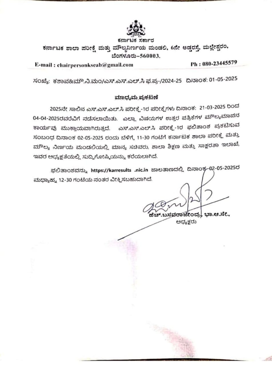 ಮಧ್ಯಾಹ್ನ 12.30ರ ನಂತರ ವೆಬ್ಸೈಟ್ನಲ್ಲಿ SSLC ಫಲಿತಾಂಶ ಲಭ್ಯವಾಗಲಿದೆ. http://karresults.nic.in ಜಾಲತಾಣದಲ್ಲಿ ಫಲಿತಾಂಶ ವೀಕ್ಷಿಸಬಹುದಾಗಿದೆ.