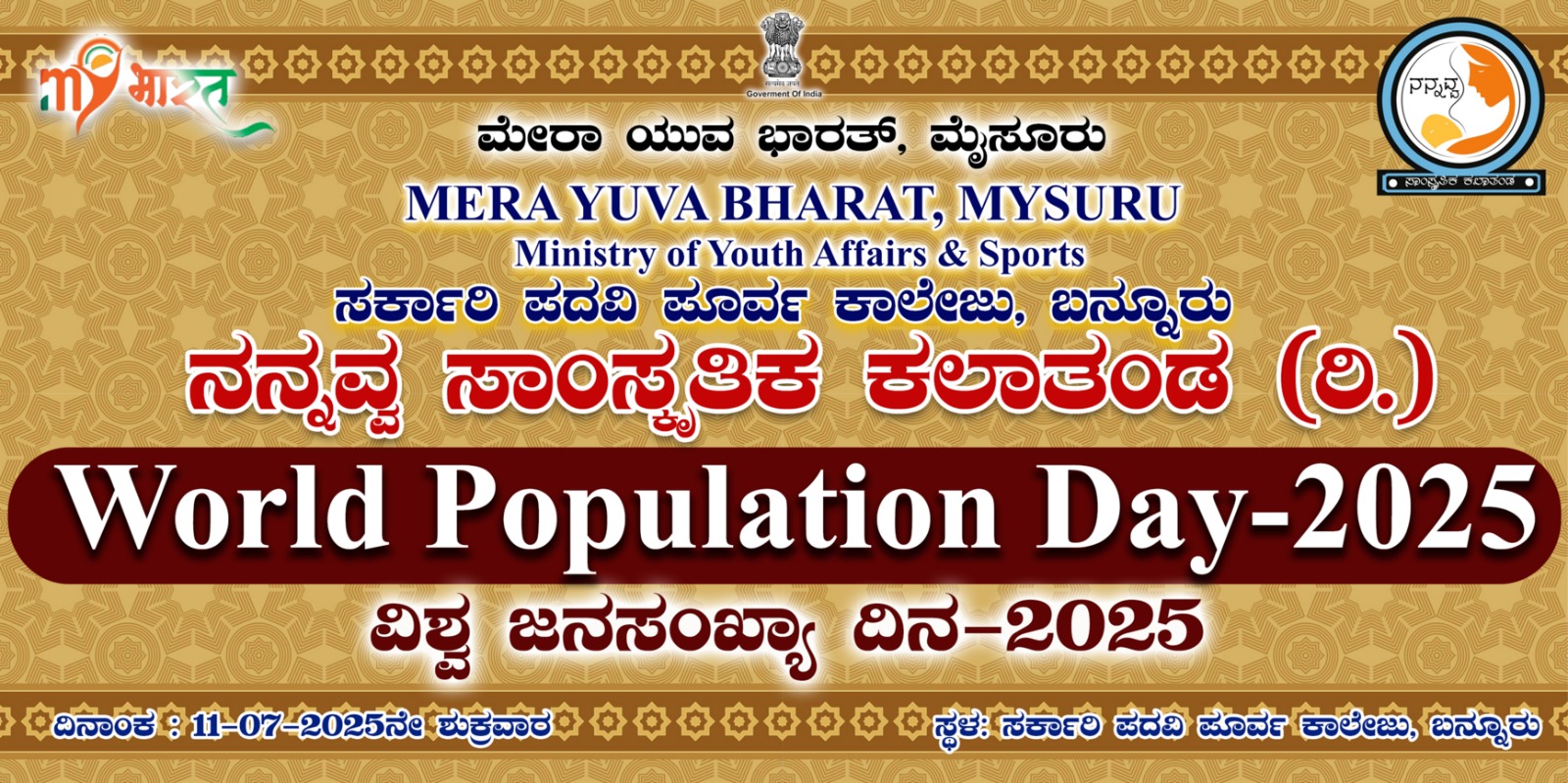ತಾಲ್ಲೂಕಿನ ಬನ್ನೂರು ಪಟ್ಚಣದ ಸರ್ಕಾರಿ ಪದವಿ ಪೂರ್ವ ಕಾಲೇಜಿನಲ್ಲಿ ನನ್ನವ್ವ ಸಾಂಸ್ಕೃತಿಕ ಕಲಾತಂಡ,ಮೇರ ಯುವ ಭಾರತ್ ಮೈಸೂರು ಹಾಗೂ ರಾಷ್ಟ್ರೀಯ ಸೇವಾ ಯೋಜನ ಘಟಕ ಸಹಯೋಗದಲ್ಲಿ ಆಯೋಜಿಸಿದ್ದ ವಿಶ್ವ ಜನಸಂಖ್ಯಾ ದಿನಾಚರಣೆ ಕಾರ್ಯಕ್ರಮದ ಉದ್ಘಾಟನೆ ನೆರವೇರಿಸಿ ಮಾತನಾಡಿ1987ರ ಜುಲೈ 11ರಂದು ವಿಶ್ವದ ಜನಸಂಖ್ಯೆಯು 500 ಕೋಟಿಯನ್ನು ಮೀರಿದ ಸಂದರ್ಭದಲ್ಲಿ ವಿಶ್ವಸಂಸ್ಥೆಯು ಹೆಚ್ಚುತ್ತಿರುವ ಜನಸಂಖ್ಯೆಯಿಂದಾಗಿ ಆಗುವ ಪರಿಣಾಮಗಳ ಕುರಿತಾಗಿ ಜನಗಳಲ್ಲಿ ಜಾಗೃತಿ ಮೂಡಿಸುವ ಸಲುವಾಗಿ ಈ ದಿನವನ್ನು ವಿಶ್ವ ಜನಸಂಖ್ಯಾ ದಿನಾಚರಣೆ ಮಾಡಲು 1987ರ ಜುಲೈ 11 ರಿಂದ ಪ್ರಾರಂಭಿಸಲಾಯಿತು.ಈ ಕಾರಣಕ್ಕಾಗಿ ನಮ್ಮ ದೇಶದಲ್ಲಿ ಸರ್ಕಾರಗಳು ಒಂದು ಮಗು ಬೇಕು ಎರಡು ಮಗು ಸಾಕು ಎಂಬ ಕಾನೂನನ್ನ ಎಷ್ಟೋ ವರ್ಷಗಳ ಹಿಂದೆಯೇ ತಂದಿದ್ದರು ಅದು ಪಾಲನೆಯಾಗದೇ ದಿನೇ,ದಿನೇ ಜನಸಂಖ್ಯೆ ಹೆಚ್ಚುತ್ತಲೇ ಇದೆ ಎಂದು ಆತಂಕ ವ್ಯಕ್ತಪಡಿಸಿದರು.