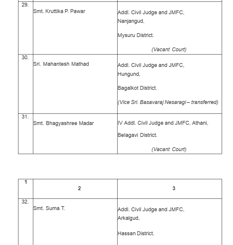 ಇದೇ ವೇಳೆ, ಇತ್ತೀಚೆಗೆ ನ್ಯಾಯಾಂಗ ಸೇವೆಗೆ ನೇಮಕವಾಗಿರುವ 32 ನೂತನ ಸಿವಿಲ್ ನ್ಯಾಯಾಧೀಶರನ್ನು ಖಾಲಿ ಹುದ್ದೆಗಳಿಗೆ ನಿಯೋಜಿಸಿ ಹೈಕೋರ್ಟ್ ಆದೇಶ ಹೊರಡಿಸಿದೆ.